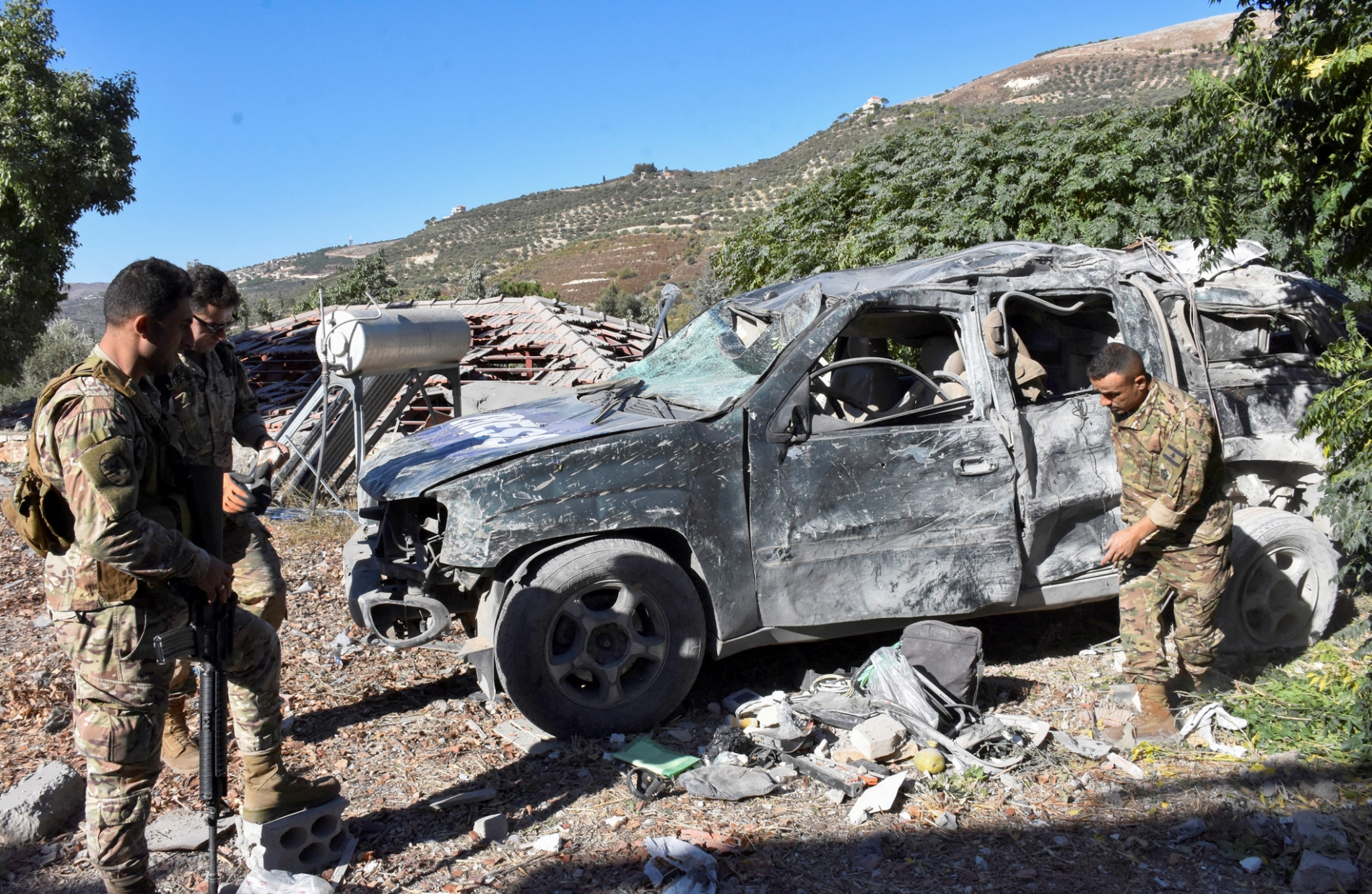 جنود من الجيش اللبناني يتفقدون سيارة متضررة مكتوب عليها “صحافة” في موقع غارة إسرائيلية أسفرت عن مقتل عدد من الصحفيين، في حاصبيا في جنوب لبنان، 25 أكتوبر